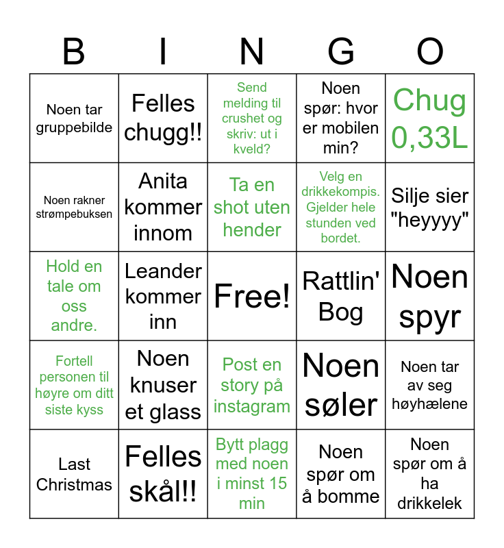 This bingo card has a free space and 24 words: Noen knuser et glass, Felles skål!!, Ta en shot uten hender, Last Christmas, Chug 0,33L, Noen tar gruppebilde, Noen rakner strømpebuksen, Felles chugg!!, Rattlin' Bog, Post en story på instagram, Velg en drikkekompis. Gjelder hele stunden ved bordet., Hold en tale om oss andre., Noen søler, Noen tar av seg høyhælene, Anita kommer innom, Noen spør om å bomme, Noen spyr, Send melding til crushet og skriv: ut i kveld?, Silje sier "heyyyy", Leander kommer inn, Noen spør om å ha drikkelek, Fortell personen til høyre om ditt siste kyss, Noen spør: hvor er mobilen min? and Bytt plagg med noen i minst 15 min.