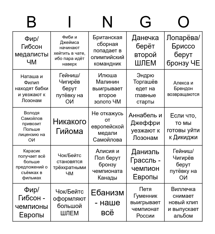 This bingo card has a free space and 24 words: Чок/Бейтс становятся трёхкратными ЧМ, Чок/Бейтс оформляют большой ШЛЕМ, Илюша Малинин выигрывает второе золото ЧМ, Фир/Гибсон - чемпионы Европы, Лопарёва/Бриссо берут бронзу ЧЕ, Фир/Гибсон медалисты ЧМ, Наташа и Филип находят бабки и уезжают к Лозонам, Фиби и Джеймса начинают хейтить в чате, ибо пара идёт наверх, Аннабель и Джеффри уезжают к Лозонам, Алисия и Пол берут бронзу чемпионата Канады, Эндрю Торгашёв едет на главные старты, Володя Самойлов привозит Польше лицензию на ОИ, Даниэль Грассль - чемпион Европы, Гейниш/Чигирёв берут путёвку на ОИ, Гейниш/Чигирёв берут путёвку на ОИ, Петя Гуменник выигрывает чемпионат России, Если что, то мы готовы уйти к Дикиджи, Британская сборная попадает в олимпийский командник, Алекса и Брендон возвращаются, Никакого Гийома, Виллечка снимает новый клип и выпускает альбом, Карасик получает всё больше предложений о съёмках в фильмах, Данечка берёт второй ШЛЕМ and Ебанизм - наше всё.