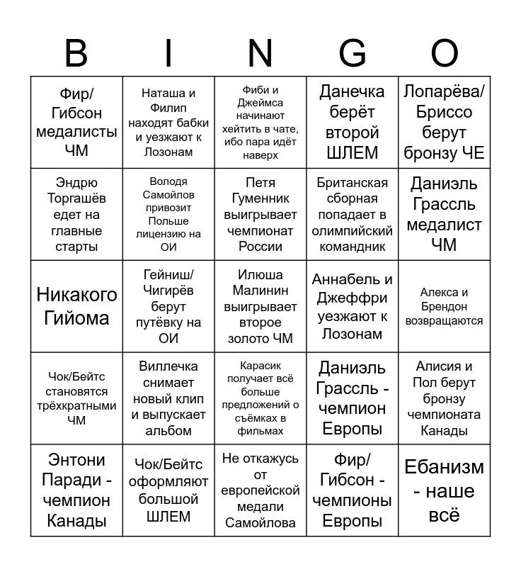 This bingo card has 25 words: Чок/Бейтс становятся трёхкратными ЧМ, Чок/Бейтс оформляют большой ШЛЕМ, Илюша Малинин выигрывает второе золото ЧМ, Фир/Гибсон - чемпионы Европы, Лопарёва/Бриссо берут бронзу ЧЕ, Фир/Гибсон медалисты ЧМ, Наташа и Филип находят бабки и уезжают к Лозонам, Фиби и Джеймса начинают хейтить в чате, ибо пара идёт наверх, Аннабель и Джеффри уезжают к Лозонам, Алисия и Пол берут бронзу чемпионата Канады, Эндрю Торгашёв едет на главные старты, Володя Самойлов привозит Польше лицензию на ОИ, Не откажусь от европейской медали Самойлова, Даниэль Грассль - чемпион Европы, Даниэль Грассль медалист ЧМ, Энтони Паради - чемпион Канады, Гейниш/Чигирёв берут путёвку на ОИ, Петя Гуменник выигрывает чемпионат России, Британская сборная попадает в олимпийский командник, Алекса и Брендон возвращаются, Никакого Гийома, Виллечка снимает новый клип и выпускает альбом, Карасик получает всё больше предложений о съёмках в фильмах, Данечка берёт второй ШЛЕМ and Ебанизм - наше всё.