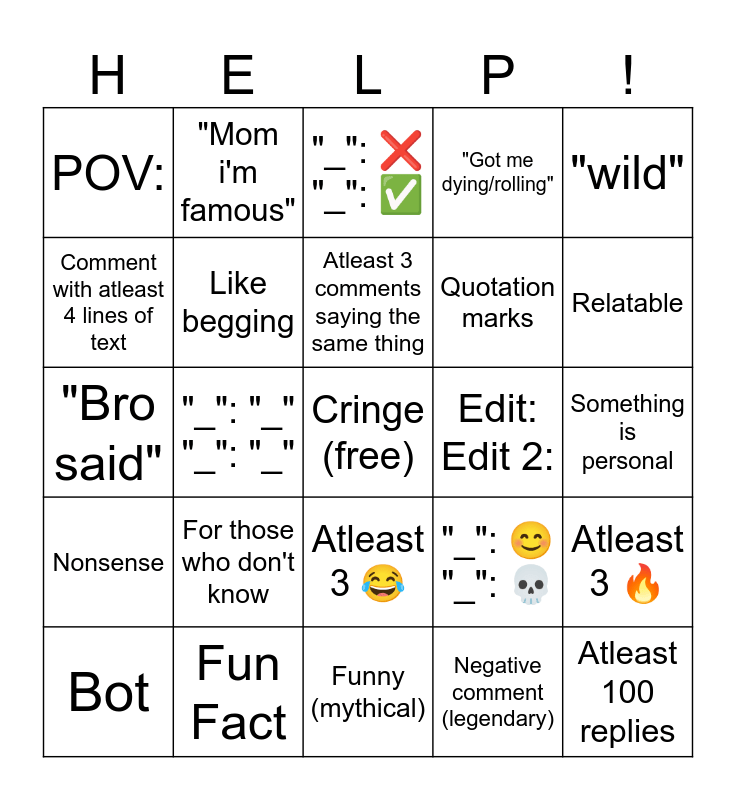 This bingo card has a free space and 24 words: For those who don't know, Fun Fact, Atleast 3 comments saying the same thing, Bot, "wild", POV:, Comment with atleast 4 lines of text, "Mom i'm famous", Edit: Edit 2:, Atleast 3 😂, Quotation marks, "Bro said", "_": 😊 "_": 💀, Atleast 3 🔥, Like begging, Negative comment (legendary), Something is personal, "_": ❌ "_": ✅, Relatable, "_": "_" "_": "_", Atleast 100 replies, Nonsense, "Got me dying/rolling" and Funny (mythical).