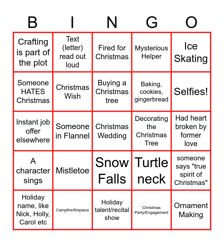 This bingo card has 25 words: Mistletoe, Holiday talent/recital show, Buying a Christmas tree, Holiday name, like Nick, Holly, Carol etc, Ice Skating, Crafting is part of the plot, Someone HATES Christmas, Text (letter) read out loud, Decorating the Christmas Tree, Snow Falls, Baking, cookies, gingerbread, Instant job offer elsewhere, Turtle neck, someone says "true spirit of Christmas", Christmas Wish, Ornament Making, Had heart broken by former love, Fired for Christmas, Selfies!, Someone in Flannel, Christmas Wedding, Campfire/fireplace, A character sings, Mysterious Helper and Christmas Party/Engagement.