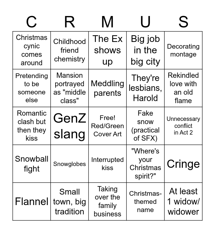 This bingo card has a free space and 29 words: Flannel, Christmas magic, GenZ slang, Caroling, Christmas cynic comes around, The Ex shows up, Mansion portrayed as "middle class", Snowglobes, Fake snow (practical of SFX), Small town, big tradition, Unnecessary conflict in Act 2, At least 1 widow/ widower, Taking over the family business, Christmas-themed name, Rekindled love with an old flame, Christmas tree shopping, Interrupted kiss, Snowball fight, Decorating montage, Romantic clash but then they kiss, "Where's your Christmas spirit?", Charity, They're lesbians, Harold, Pretending to be someone else, Big job in the big city, Childhood friend chemistry, Cringe, Meddling parents and Bakery scene.