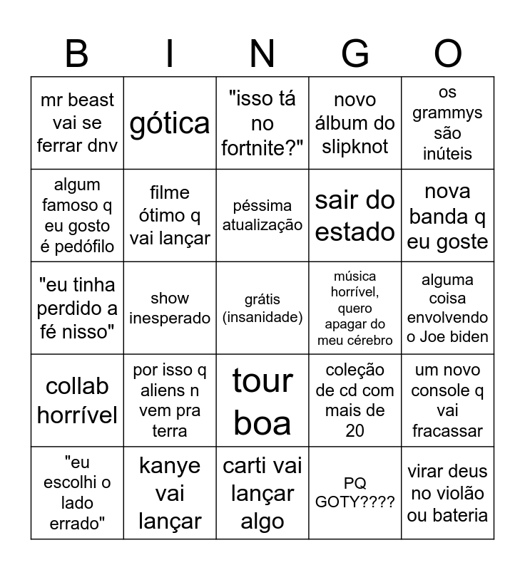 This bingo card has a free space and 24 words: "eu escolhi o lado errado", por isso q aliens n vem pra terra, péssima atualização, PQ GOTY????, os grammys são inúteis, mr beast vai se ferrar dnv, gótica, "isso tá no fortnite?", música horrível, quero apagar do meu cérebro, alguma coisa envolvendo o Joe biden, "eu tinha perdido a fé nisso", filme ótimo q vai lançar, coleção de cd com mais de 20, um novo console q vai fracassar, algum famoso q eu gosto é pedófilo, kanye vai lançar, carti vai lançar algo, novo álbum do slipknot, nova banda q eu goste, collab horrível, show inesperado, tour boa, sair do estado and virar deus no violão ou bateria.