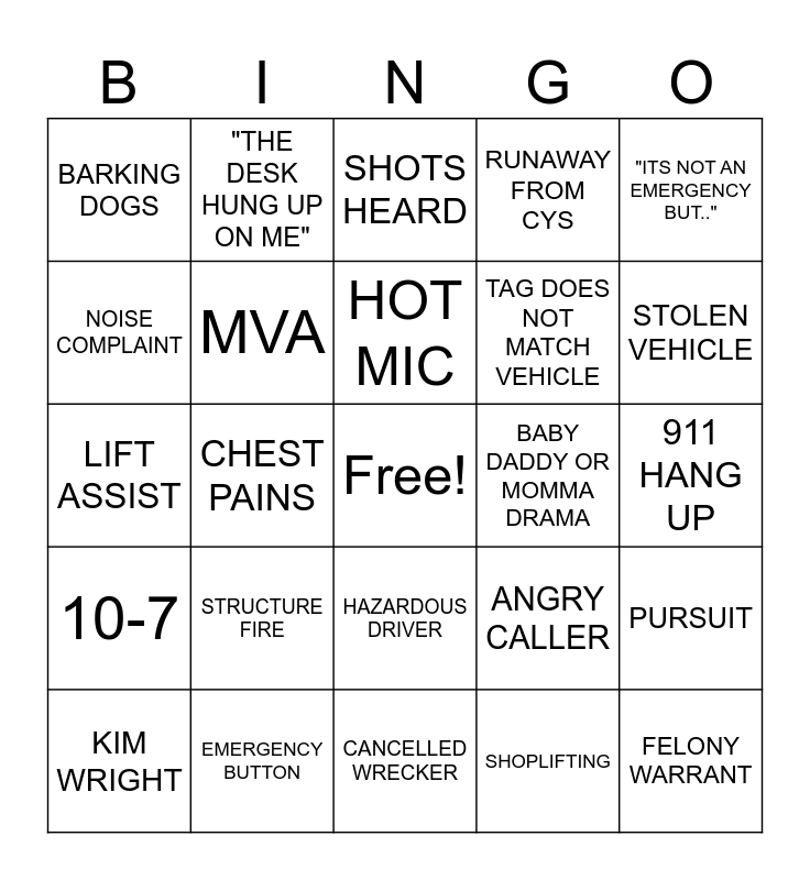 This bingo card has a free space and 24 words: STRUCTURE FIRE, EMERGENCY BUTTON, HOT MIC, KIM WRIGHT, "ITS NOT AN EMERGENCY BUT..", BARKING DOGS, NOISE COMPLAINT, "THE DESK HUNG UP ON ME", BABY DADDY OR MOMMA DRAMA, HAZARDOUS DRIVER, TAG DOES NOT MATCH VEHICLE, LIFT ASSIST, ANGRY CALLER, PURSUIT, MVA, SHOPLIFTING, 911 HANG UP, SHOTS HEARD, STOLEN VEHICLE, CHEST PAINS, FELONY WARRANT, 10-7, RUNAWAY FROM CYS and CANCELLED WRECKER.