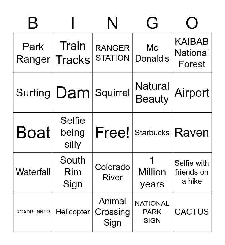 This bingo card has a free space and 45 words: WELCOME TO GRAND CANYON SIGN, CACTUS, INDIAN RESERVATION, ROADRUNNER, LIZARD, NATIONAL PARK SIGN, RANGER STATION, HIGHWAY 64 SIGN, KAIBAB National Forest, Helicopter, Mc Donald's, Starbucks, Colorado River, South Rim Sign, Pine Tree, Animal Crossing Sign, Car towing a trailer, Boat, Campground, Airport, Train Tracks, CA Condor, Picnic Table, Park Ranger, Horseshoe Bend, Raven, Schitz, Vishnu, 1 Million years, Waterfall, Valley River, Selfie with friends on a hike, Selfie doing something new, Selfie trying a new food, Silly socks, Selfie being silly, Environmental impact, Random act of kindness, Making a positive impact, Squirrel, Surfing, Natural Beauty, Geological formation, Dam and Viva LAS Vegas.