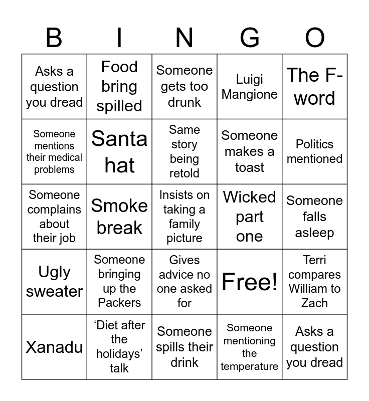 This bingo card has 25 words: Someone bringing up the Packers, Someone spills their drink, Same story being retold, Xanadu, The F-word, Asks a question you dread, Someone mentions their medical problems, Food bring spilled, Wicked part one, Gives advice no one asked for, Someone makes a toast, Someone complains about their job, Free!, Terri compares William to Zach, Santa hat, Asks a question you dread, Someone falls asleep, Someone gets too drunk, Politics mentioned, Smoke break, Insists on taking a family picture, ‘Diet after the holidays’ talk, Ugly sweater, Luigi Mangione and Someone mentioning the temperature.