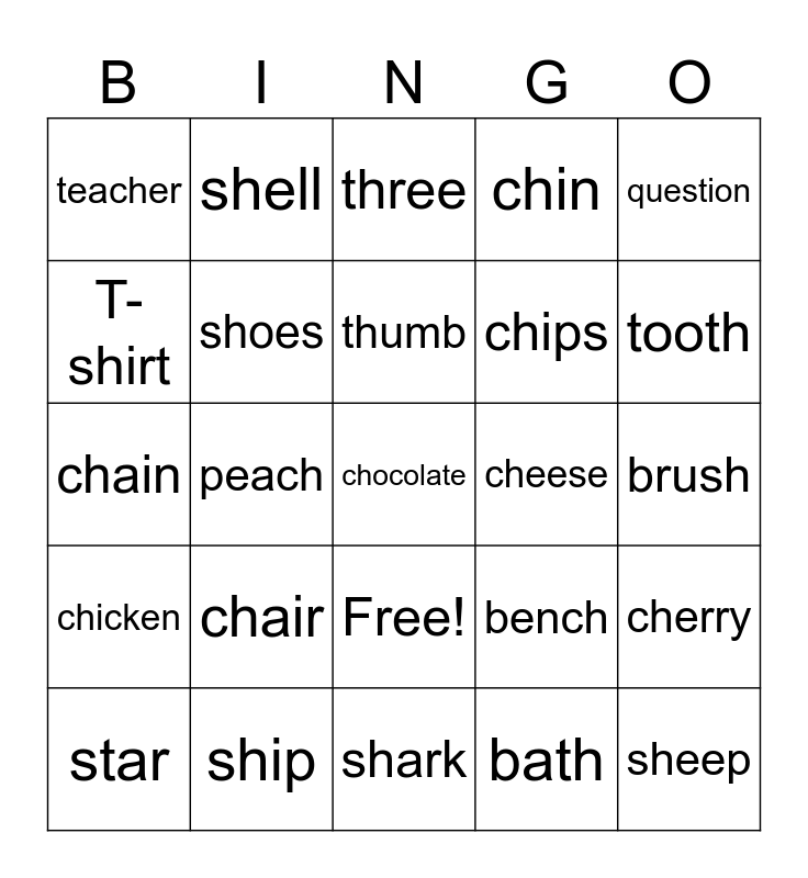 This bingo card has 26 words: Free!, bath, thumb, ship, question, teacher, T-shirt, shell, brush, bench, chips, chain, cherry, star, peach, beach, chin, chicken, three, chocolate, tooth, shark, cheese, chair, shoes and sheep.