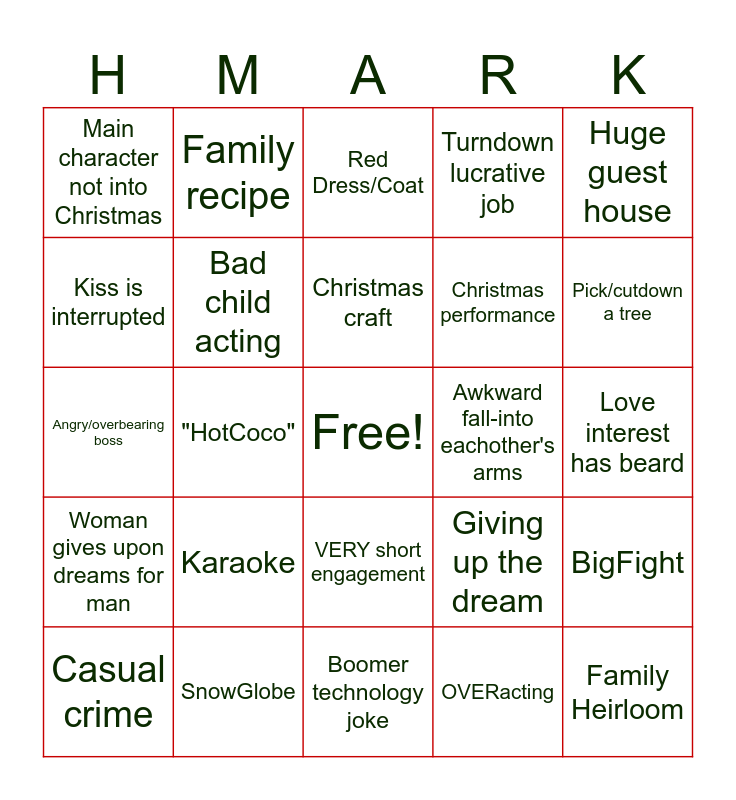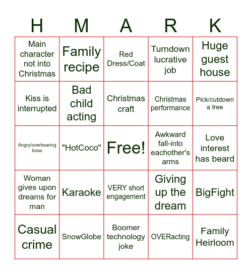 This bingo card has a free space and 43 words: Obviously not real snow, Family Heirloom, Activity with Santa, Casual crime, Impulsive decision, OVERacting, Red Dress/Coat, Leave big city for small town, Huge guest house, SnowGlobe, Turndown lucrative job, Awkward fall-into eachother's arms, VERY short engagement, Karaoke, Could be not a Christmas Movie, Boomer technology joke, Life long dream, Angry/overbearing boss, Family tradition, Pick/cutdown a tree, Family recipe, Trying to save a business, Decorating cookies, Main character not into Christmas, Casual racism, Love interest has beard, Knock off Christmas Music, DeadParents/Spouse, Giving up the dream, Woman gives upon dreams for man, Sage token minority, BigFight, Obviously shot not in winter, "HotCoco", Cartoon Supervillain, Token LGBT, Bad props, Christmas craft, Kiss is interrupted, Christmas performance, Ice skating, Bad child acting and An oldflame.