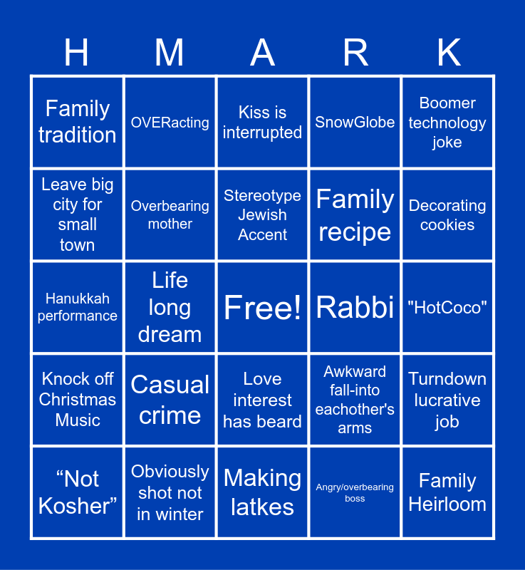 This bingo card has a free space and 47 words: Obviously not real snow, Family Heirloom, Spin a dreidel, Making latkes, Casual crime, Impulsive decision, OVERacting, Blue Dress/Coat, Leave big city for small town, Huge guest house, Overbearing mother, SnowGlobe, Turndown lucrative job, Awkward fall-into eachother's arms, VERY short engagement, Karaoke, Stereotype Jewish Accent, Rabbi, Somebody is the Cantor, Boomer technology joke, Life long dream, Angry/overbearing boss, Family tradition, Family recipe, Trying to save a business, Decorating cookies, “Not Kosher”, Casual racism, Love interest has beard, Knock off Christmas Music, DeadParents/Spouse, Mentions Christmas, Woman gives upon dreams for man, Sage token minority, BigFight, Obviously shot not in winter, "HotCoco", Cartoon Supervillain, Token LGBT, Bad props, Hanukkah craft, Kiss is interrupted, Hanukkah performance, 100 Baby Challenge, Ice skating, Bad child acting and An oldflame.