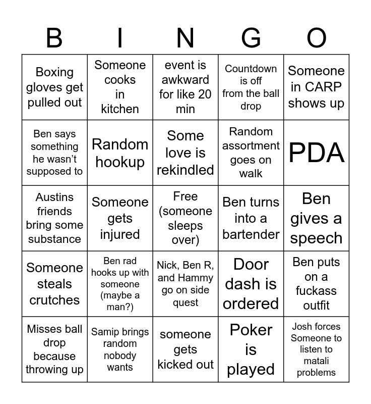 This bingo card has a free space and 24 words: Ben rad hooks up with someone (maybe a man?), Samip brings random nobody wants, Some love is rekindled, Misses ball drop because throwing up, Someone in CARP shows up, Boxing gloves get pulled out, Ben says something he wasn’t supposed to, Someone cooks in kitchen, Ben turns into a bartender, Nick, Ben R, and Hammy go on side quest, Random assortment goes on walk, Austins friends bring some substance, Door dash is ordered, Ben puts on a fuckass outfit, Random hookup, Poker is played, Ben gives a speech, event is awkward for like 20 min, PDA, Someone gets injured, Josh forces Someone to listen to matali problems, Someone steals crutches, Countdown is off from the ball drop and someone gets kicked out.