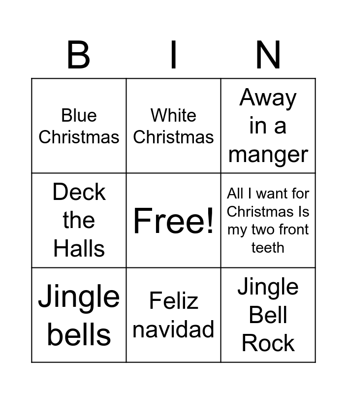 This bingo card has a free space and 14 words: Rudolph the red nose raindeer, Here comes Santa Claus, Jingle bells, White Christmas, Deck the Halls, Jingle Bell Rock, We wish you a Merry Christmas, Santa Claus is coming to town, Feliz navidad, Blue Christmas, Silver bells, All I want for Christmas Is my two front teeth, Away in a manger and It's beginning to look a lot like Christmas.