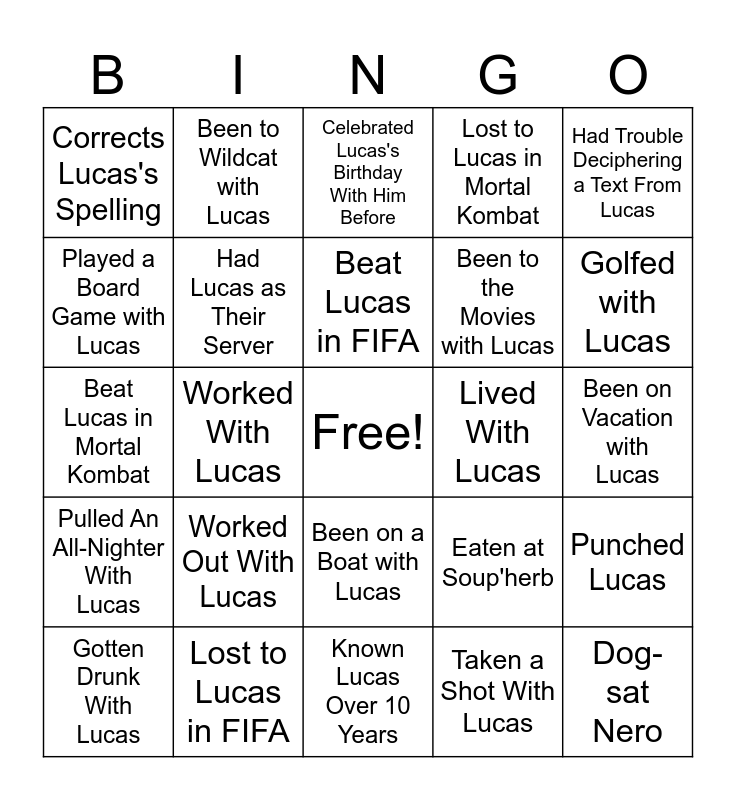 This bingo card has a free space and 31 words: Known Lucas Over 10 Years, Shared a Bed With Lucas, Worked With Lucas, Laughs At Lucas's Jokes, Corrects Lucas's Spelling, Celebrated Lucas's Birthday With Him Before, Had Lucas as Their Server, Eaten at Soup'herb, Lived With Lucas, Taken a Shot With Lucas, Been on Vacation with Lucas, Dog-sat Nero, Been to a Concert With Lucas, Gone Snowboarding With Lucas, Golfed with Lucas, Snorkeled with Lucas, Punched Lucas, Worked Out With Lucas, Pulled An All-Nighter With Lucas, Been on a Boat with Lucas, Had Trouble Deciphering a Text From Lucas, Been Camping With Lucas, Gotten Drunk With Lucas, Been to Wildcat with Lucas, Been to the Movies with Lucas, Played a Board Game with Lucas, Lost to Lucas in Mortal Kombat, Beat Lucas in Mortal Kombat, Lost to Lucas in FIFA, Beat Lucas in FIFA and Played VR with Lucas.