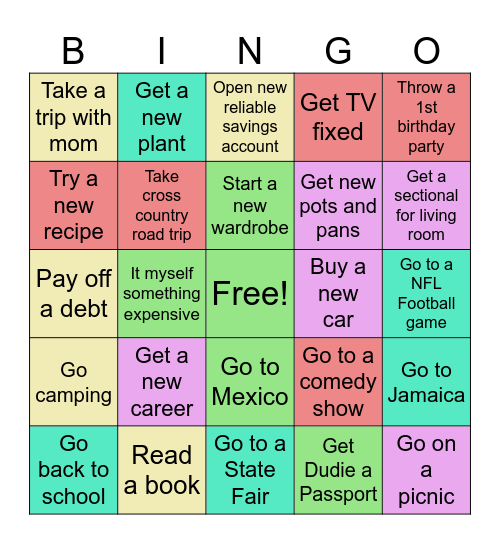 This bingo card has a free space and 24 words: Get a new career, Read a book, Start a new wardrobe, Go back to school, Throw a 1st birthday party, Take a trip with mom, Try a new recipe, Get a new plant, Buy a new car, Go to Mexico, Get new pots and pans, Pay off a debt, Go to a comedy show, Go to Jamaica, Take cross country road trip, Get Dudie a Passport, Go to a NFL Football game, Open new reliable savings account, Get a sectional for living room, It myself something expensive, Go on a picnic, Go camping, Get TV fixed and Go to a State Fair.