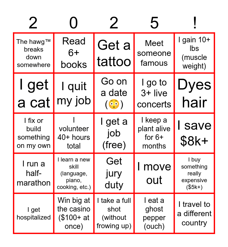 This bingo card has a free space and 24 words: I learn a new skill (language, piano, cooking, etc.), Win big at the casino ($100+ at once), Go on a date (😳), I get hospitalized, I gain 10+ lbs (muscle weight), The hawg™ breaks down somewhere, I get a cat, Read 6+ books, I keep a plant alive for 6+ months, Get jury duty, I go to 3+ live concerts, I fix or build something on my own, I move out, I buy something really expensive ($5k+), I quit my job, I eat a ghost pepper (ouch), I save $8k+, Get a tattoo, Dyes hair, I volunteer 40+ hours total, I travel to a different country, I run a half-marathon, Meet someone famous and I take a full shot (without frowing up).