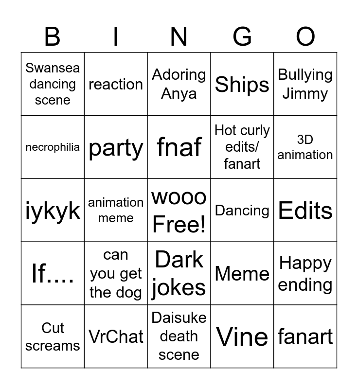 This bingo card has a free space and 24 words: can you get the dog, VrChat, fnaf, Cut screams, Bullying Jimmy, Swansea dancing scene, necrophilia, reaction, Dancing, Dark jokes, Hot curly edits/ fanart, iykyk, Meme, Happy ending, party, Vine, Edits, Adoring Anya, 3D animation, animation meme, fanart, If...., Ships and Daisuke death scene.