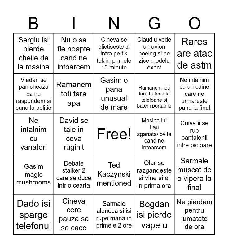 This bingo card has a free space and 24 words: Dado isi sparge telefonul, Debate stalker 2 care se duce intr o cearta, Gasim o pana unusual de mare, Bogdan isi pierde vape u, Rares are atac de astm, Sergiu isi pierde cheile de la masina, Nu o sa fie noapte cand ne intoarcem, Cineva se plictiseste si intra pe tik tok in primele 10 minute, Masina lui Lau zgariata/lovita cand ne intoarcem, Cuiva ii se rup pantalonii intre picioare, Ne intalnim cu vanatori, Ramanem toti fara apa, Olar se razgandeste si vine si el in prima ora, Sarmale muscat de o vipera la final, Vladan se panicheaza ca nu raspundem si suna la politie, Cineva cere pauza sa se cace, Sarmale aluneca si isi rupe mana in primele 2 ore, Claudiu vede un avion boeing si ne zice modelu exact, Ne intalnim cu un caine care ne urmareste pana la final, Gasim magic mushrooms, David se taie in ceva ruginit, Ted Kaczynski mentioned, Ramanem toti fara baterie la telefoane si baterii portabile and Ne pierdem pentru jumatate de ora.