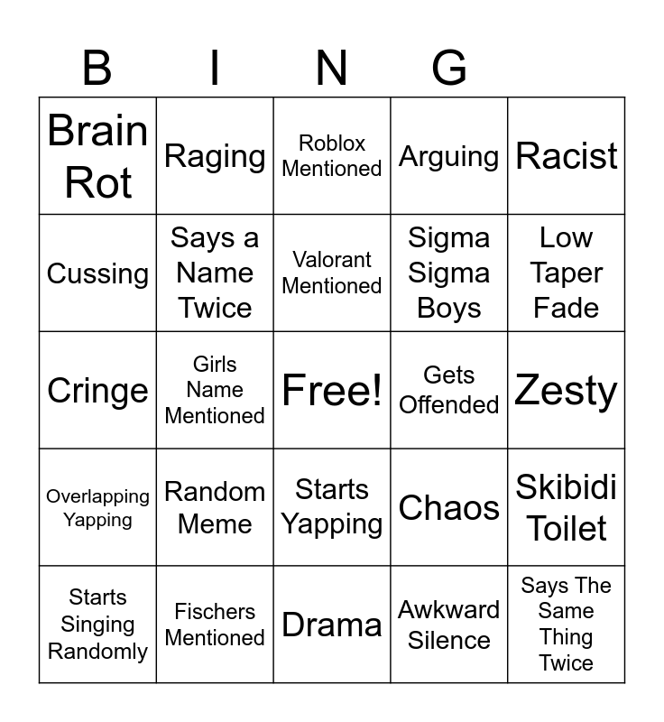 This bingo card has a free space and 24 words: Random Meme, Fischers Mentioned, Valorant Mentioned, Starts Singing Randomly, Racist, Brain Rot, Cussing, Raging, Gets Offended, Starts Yapping, Sigma Sigma Boys, Cringe, Chaos, Skibidi Toilet, Says a Name Twice, Awkward Silence, Zesty, Roblox Mentioned, Low Taper Fade, Girls Name Mentioned, Says The Same Thing Twice, Overlapping Yapping, Arguing and Drama.