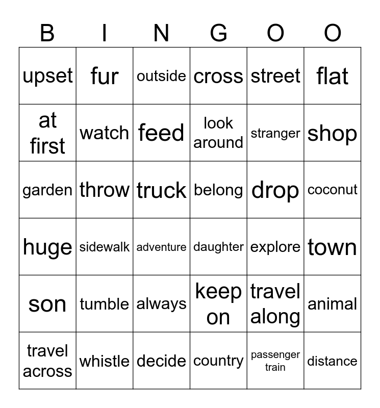 This bingo card has 36 words: keep on, always, country, at first, huge, belong, watch, decide, street, travel along, shop, cross, animal, throw, look around, upset, son, drop, garden, outside, truck, sidewalk, daughter, adventure, explore, fur, stranger, whistle, feed, flat, distance, travel across, town, coconut, tumble and passenger train.