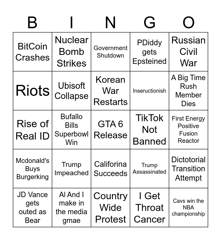 This bingo card has a free space and 24 words: Trump Impeached, Al And I make in the media gmae, Korean War Restarts, JD Vance gets outed as Bear, Russian Civil War, BitCoin Crashes, Riots, Nuclear Bomb Strikes, TikTok Not Banned, Califorina Succeeds, Inseructionish, Rise of Real ID, Trump Assassinated, Dictotorial Transition Attempt, Ubisoft Collapse, I Get Throat Cancer, First Energy Positive Fusion Reactor, Government Shutdown, A Big Time Rush Member Dies, Bufallo Bills Superbowl Win, Cavs win the NBA championship, Mcdonald's Buys Burgerking, PDiddy gets Epsteined and Country Wide Protest.