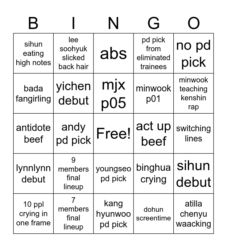 This bingo card has a free space and 24 words: 9 members final lineup, 7 members final lineup, mjx p05, 10 ppl crying in one frame, no pd pick, sihun eating high notes, bada fangirling, lee soohyuk slicked back hair, act up beef, youngseo pd pick, minwook p01, antidote beef, binghua crying, sihun debut, yichen debut, dohun screentime, switching lines, abs, minwook teaching kenshin rap, andy pd pick, atilla chenyu waacking, lynnlynn debut, pd pick from eliminated trainees and kang hyunwoo pd pick.