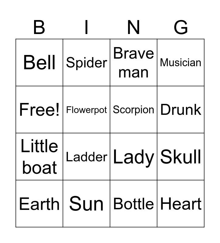 This bingo card has 17 words: Earth, Sun, Brave man, Musician, Little boat, Flowerpot, Lady, Drunk, Free!, Ladder, Bottle, Skull, Bell, Spider, Scorpion, Heart and El sol.