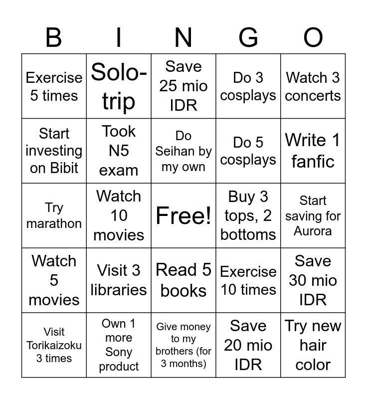This bingo card has a free space and 24 words: Visit 3 libraries, Own 1 more Sony product, Do Seihan by my own, Visit Torikaizoku 3 times, Watch 3 concerts, Exercise 5 times, Start investing on Bibit, Solo-trip, Buy 3 tops, 2 bottoms, Read 5 books, Do 5 cosplays, Try marathon, Exercise 10 times, Save 30 mio IDR, Took N5 exam, Save 20 mio IDR, Start saving for Aurora, Save 25 mio IDR, Write 1 fanfic, Watch 10 movies, Try new hair color, Watch 5 movies, Do 3 cosplays and Give money to my brothers (for 3 months).