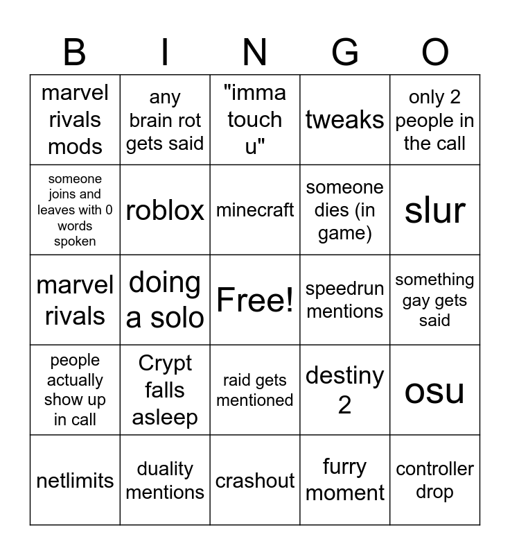 This bingo card has a free space and 24 words: Crypt falls asleep, duality mentions, minecraft, netlimits, only 2 people in the call, marvel rivals mods, someone joins and leaves with 0 words spoken, any brain rot gets said, speedrun mentions, raid gets mentioned, someone dies (in game), marvel rivals, destiny 2, osu, roblox, furry moment, something gay gets said, "imma touch u", slur, doing a solo, controller drop, people actually show up in call, tweaks and crashout.