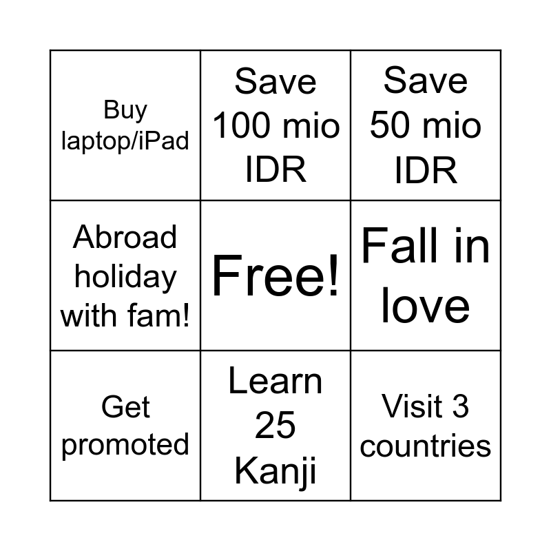 This bingo card has a free space and 8 words: Fall in love, Save 50 mio IDR, Save 100 mio IDR, Get promoted, Buy laptop/iPad, Visit 3 countries, Abroad holiday with fam! and Learn 25 Kanji.