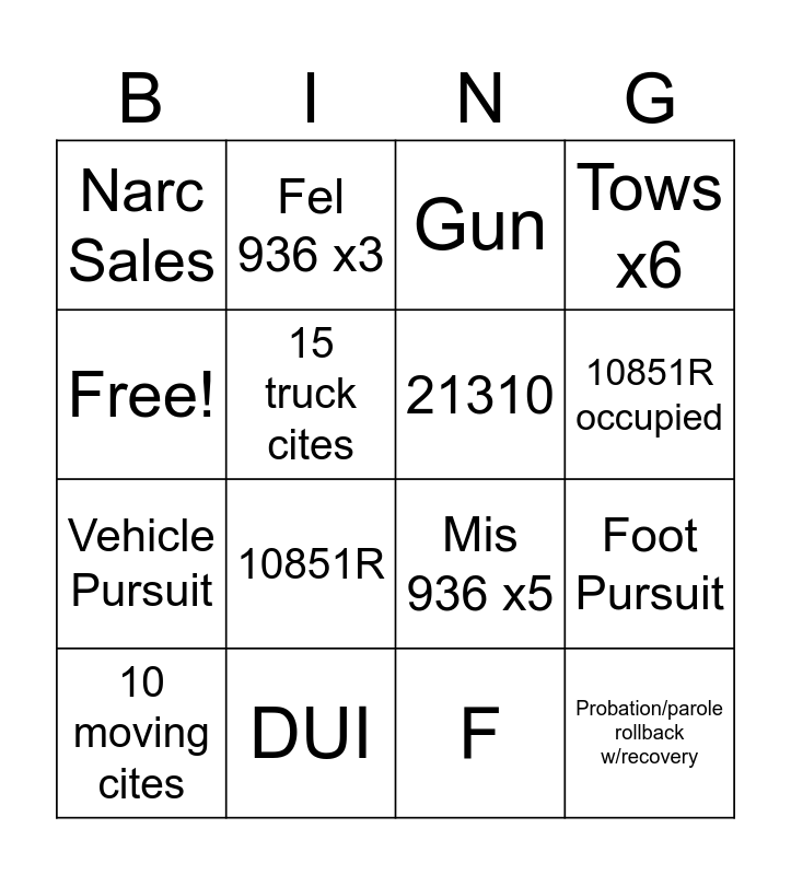This bingo card has 16 words: DUI, Foot Pursuit, Gun, Narc Sales, Vehicle Pursuit, Fel 936 x3, Mis 936 x5, F, Free!, 15 truck cites, 10 moving cites, Tows x6, 10851R, 10851R occupied, 21310 and Probation/parole rollback w/recovery.