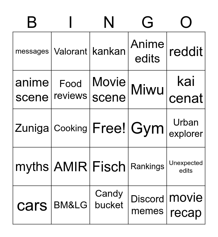 This bingo card has a free space and 24 words: AMIR, BM&LG, Movie scene, cars, reddit, messages, anime scene, Valorant, Gym, Fisch, Miwu, Zuniga, Rankings, Unexpected edits, Food reviews, Discord memes, Urban explorer, kankan, kai cenat, Cooking, movie recap, myths, Anime edits and Candy bucket.