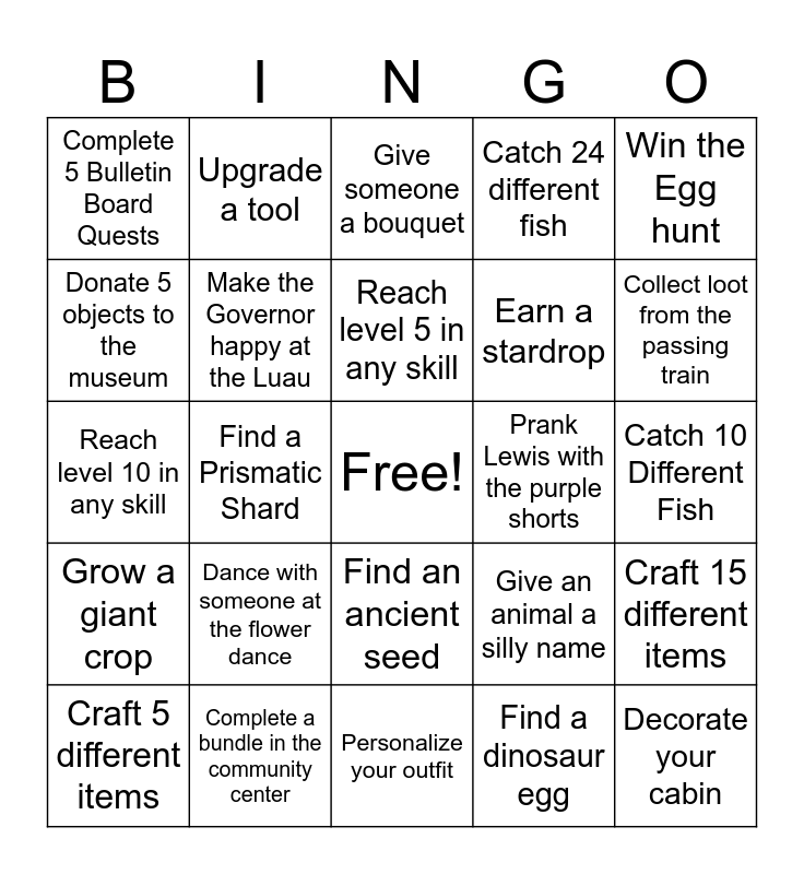 This bingo card has a free space and 24 words: Dance with someone at the flower dance, Complete a bundle in the community center, Reach level 5 in any skill, Craft 5 different items, Win the Egg hunt, Complete 5 Bulletin Board Quests, Donate 5 objects to the museum, Upgrade a tool, Prank Lewis with the purple shorts, Find an ancient seed, Earn a stardrop, Reach level 10 in any skill, Give an animal a silly name, Craft 15 different items, Make the Governor happy at the Luau, Find a dinosaur egg, Catch 10 Different Fish, Give someone a bouquet, Collect loot from the passing train, Find a Prismatic Shard, Decorate your cabin, Grow a giant crop, Catch 24 different fish and Personalize your outfit.
