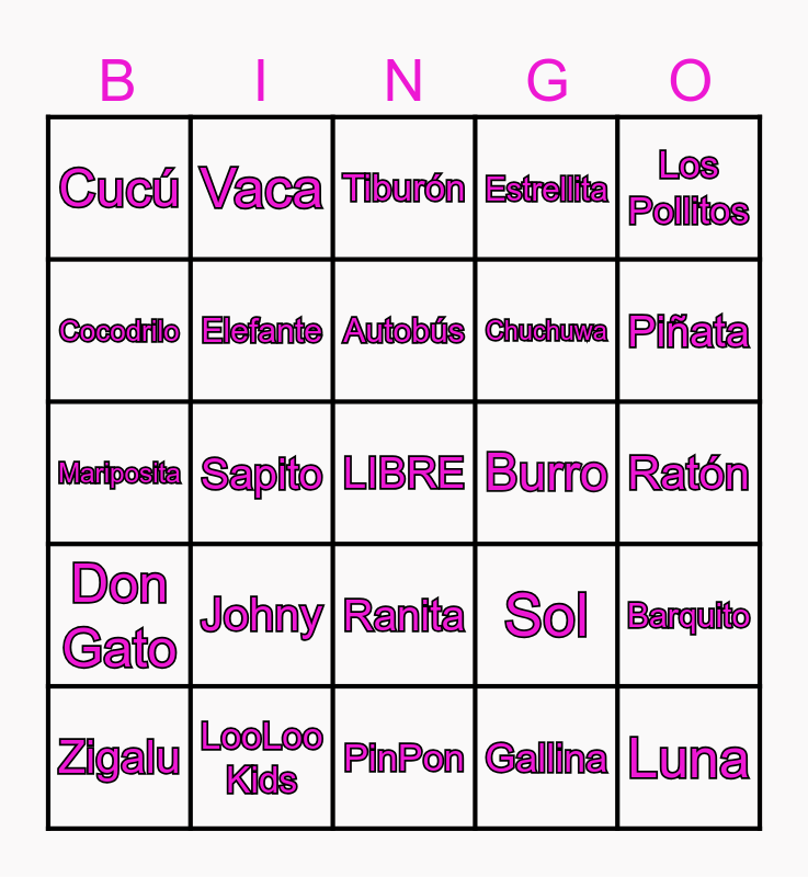 This bingo card has a free space and 24 words: Johny, LooLoo Kids, Autobús, Zigalu, Los Pollitos, Cucú, Cocodrilo, Vaca, Burro, Ranita, Chuchuwa, Mariposita, Sol, Barquito, Elefante, Gallina, Ratón, Tiburón, Piñata, Sapito, Luna, Don Gato, Estrellita and PinPon.