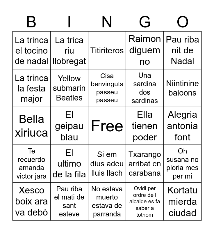 This bingo card has a free space and 26 words: Si em dius adeu lluis llach, Ovidi per ordre de l alcalde es fa saber a tothom, Cisa benvinguts passeu passeu, Pau riba el mati de sant esteve, Pau riba nit de Nadal, La trinca el tocino de nadal, La trinca la festa major, La trica riu llobregat, Alegria antonia font, Txarango arribat en carabana, Una sardina dos sardinas, Bella xiriuca, Oh susana no ploria mes per mi, Xesco boix ara va debò, El geipau blau, Marrameu torra castanyes, Raimon diguem no, Te recuerdo amanda victor jara, Titiriteros, Kortatu mierda ciudad, Niintinine baloons, No estava muerto estava de parranda, Ella tienen poder, El ultimo de la fila, Yellow submarin Beatles and Llarg i prim parent d'en bufa.