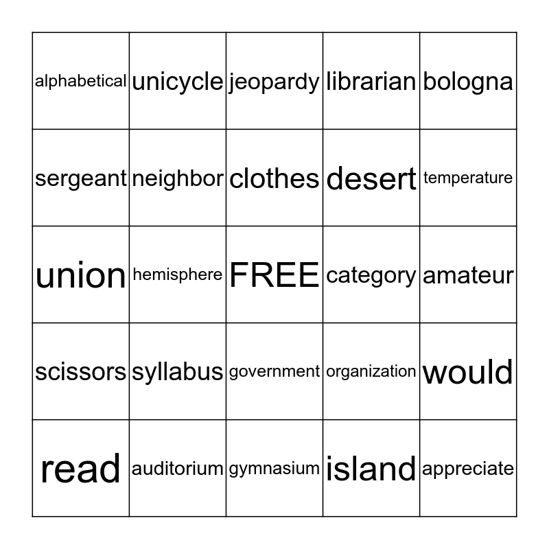 This bingo card has a free space and 37 words: there, refrigerator, knead, neighbor, would, syllabus, clothes, gigantic, bologna, oriental, hemisphere, librarian, appreciate, amateur, sergeant, scissors, bibliography, jeopardy, government, category, alphabetical, temperature, read, gymnasium, thought, island, unicycle, planetarium, cafeteria, veterinarian, cooperation, auditorium, union, onion, organization, desert and dessert.