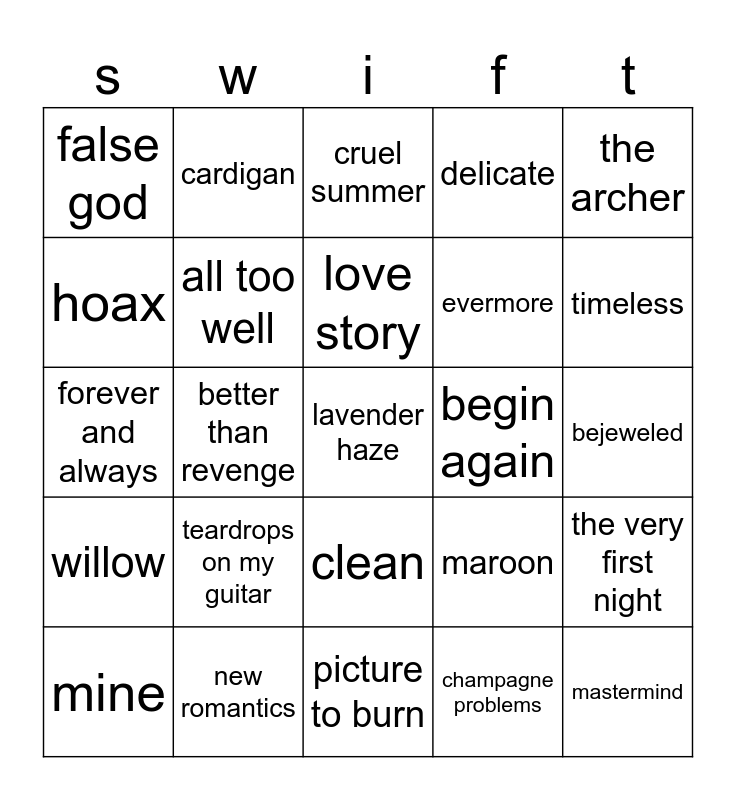 This bingo card has 25 words: teardrops on my guitar, picture to burn, love story, mine, the archer, false god, hoax, cardigan, begin again, clean, evermore, forever and always, maroon, the very first night, all too well, mastermind, bejeweled, cruel summer, timeless, better than revenge, lavender haze, new romantics, willow, delicate and champagne problems.