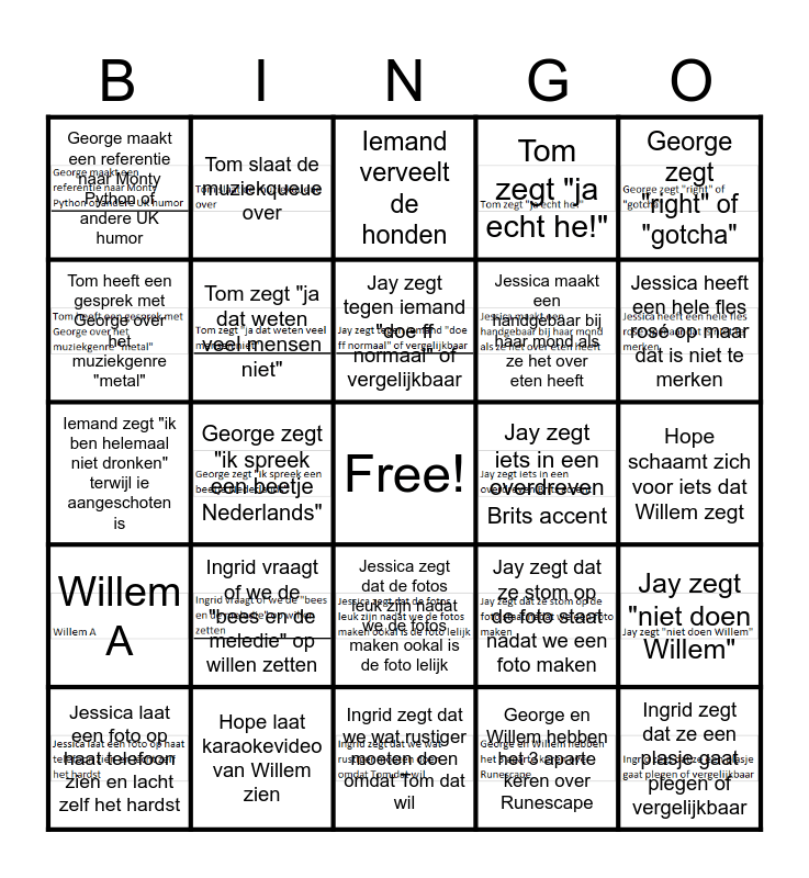 This bingo card has 31 images, a free space and 49 words: Ingrid zegt iets in de categorie "Holland got's talent", Ingrid zegt dat ze een plasje gaat plegen of vergelijkbaar, Ingrid zegt "toen Tom een transportbedrijf had" of vergelijkbaar, Ingrid zegt dat we wat rustiger moeten doen omdat Tom dat wil, Ingrid vraagt of we de "bees en de meledie" op willen zetten, Ingrid zegt "je hoeft toch geen drugs op te hebben" als ze een intense clip ziet, Tom slaat de muziekqueue over, Tom zet een nummer op met een speelduur langer dan 5 minuten, Tom heeft een gesprek met George over het muziekgenre "metal", Tom heeft een Rammstein of Till Lindemann shirt aan, Tom zegt "ja dat weten veel mensen niet", Tom zegt "ja echt he!", Jay zegt "niet doen Willem", Jay zegt dat ze stom op de foto staat nadat we een foto maken, Jay en Willem lachen samen om iets dat helemaal niet grappig is, Jay zegt tegen Willem dat hij de room moet readen of vergelijkbaar, Jay zegt tegen iemand "doe ff normaal" of vergelijkbaar, Jay zegt iets in een overdreven Brits accent, George heeft 95 mining in Runescape op of voor 31 december, George zegt "right" of "gotcha", George zegt "ik spreek een beetje Nederlands", George en Willem hebben het 3 aparte keren over Runescape, George maakt een referentie naar Monty Python of andere UK humor, Jessica maakt een handgebaar bij haar mond als ze het over eten heeft, Jessica zegt "ja ik weet niet" of vergelijkbaar, Jessica heeft een hele fles rosé op maar dat is niet te merken, Jessica laat een foto op haat telefoon zien en lacht zelf het hardst, Jessica zegt iets over de kerstboom, Jessica zegt dat de fotos leuk zijn nadat we de fotos maken ookal is de foto lelijk, Willem A, Willem B, Willem C, Willem D, Willem E, Hope laat karaokevideo van Willem zien, Hope zegt iets in de categorie "dit en dat" met klemtoon, Hope heeft het over of pakt de klankschaal, Hope zegt "wi-luhm" op de bekende toon, Hope schaamt zich voor iets dat Willem zegt, Hope is onzeker over iets, maakt niet uit wat, Iemand verbrand zich aan de pizzarette, Iemand zegt "oilballs", Iemand gebruikt een woord dat Willem haat, Iemand raadt het aantal keer dat in de Slewi "alles OK" gezegd is ± 100, Iemand zegt "ik ben helemaal niet dronken" terwijl ie aangeschoten is, Iemand verveelt de honden, Triple gromt naar Ollie, Magic gaat onder het bureau liggen and Tom roept het antwoord op een vraag in een spel waar hij niet aan meedoet.