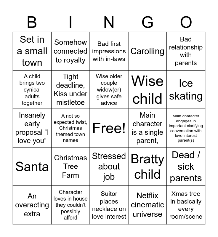 This bingo card has a free space and 86 words: Small town, Small town business in trouble, Stressed about job, Stressed about being single, Protagonist never lives life/takes chances/has fin, Something ruins the first kiss, Overeager best friend, Clumsy meets cute, I have a confession to make, Falling in love montage, Dead wife, Man “rescues” female protagonist, Dead / sick parents, Main character engages in important clarifying conversation with love interest parent(s), Non leads find love, Wise older couple widow(er) gives safe advice, Undeserving / mean romantic ex-partner, Workaholic, Magical stranger moves the plot forward, Made up country, Contemporary Christmas song that is clearly a knockoff of a classic they couldn’t afford the rights to, Finds out the real meaning of Christmas, Anything related to baking, Insanely early proposal “I love you”, Villainous business man, Netflix cinematic universe, Characters have hot chocolate, Character opens up about past trauma somehow related to Christmas, Protagonist goes to small town to get in Christmas spirit, Small town guy saves protagonist from big city life,, “I can take care of myself”, Character loves in house they couldn’t possibly afford, Character’s name is related to Christmas, e.g. Holly, Nick, Sentimental Christmas artifact / miracle plot device, Christmas Tree Farm, A child brings two cynical adults together, Misunderstandings that could easily be cleared up with a single conversation, Ice skating, Christmas themed wedding, Accidental fall that requires help up, A not so expected twist, Christmas themed town names, Flirtatious snowball fight, Scene for decorating for Christmas / putting lights up, Something that can’t be explained uses excuse of magic, Main character is a single parent,, Setting is a Christmas obsessed town, Bad relationship with parents, Stares into eyes for way too long, Somehow connected to royalty, Car breaks down in snow, Town Christmas event, Tree lighting, Snowing on Christmas day, Santa, Ex Fiance/BF GF, Ice Skating,, Snowball fight, Decorating a tree, Wise child, Carolling, Tight deadline, Kiss under mistletoe, Set in a small town, Cookies, Making a family recipe, Building a gingerbread house, Xmas decorations, Bad first impressions with in-laws, POC bestie with no life other than supporting main character, Xmas tree in basically every room/scene, Xmas themed clothing (eg wearing almost exclusively red & green), Ugly holiday sweaters, Something decorated that doesn't need to be decorated, Crying at xmas, An overacting extra, Church, Turkey, Dog that does a cute whine when the camera pans to it, Suitor places necklace on love interest, Walking on snow, Slipped on ice!, Awful/lazyscript writing, Hesitation to kiss, Gazing at stars, Wealthy family, Royalty, Bratty child and Heirloom jewellery.