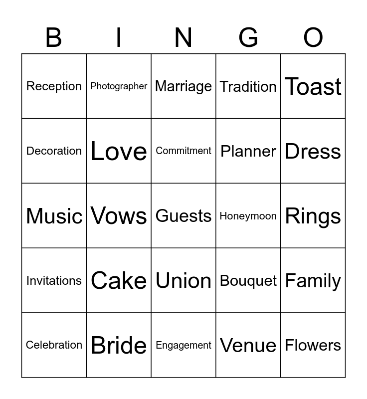This bingo card has 30 words: Bride, Groom, Vows, Ceremony, Reception, Marriage, Love, Union, Honeymoon, Engagement, Rings, Guests, Venue, Flowers, Dress, Tuxedo, Bouquet, Invitations, Cake, Toast, Music, Dance, Photographer, Planner, Decoration, Tradition, Family, Celebration, Commitment and Happiness.