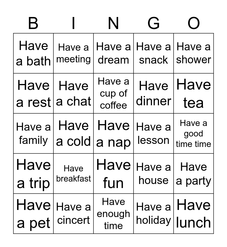 This bingo card has a free space and 24 words: Have breakfast, Have a cincert, Have a cup of coffee, Have a pet, Have a shower, Have a bath, Have a rest, Have a meeting, Have a lesson, Have fun, Have dinner, Have a family, Have a house, Have a party, Have a chat, Have a holiday, Have a good time time, Have a dream, Have tea, Have a cold, Have lunch, Have a trip, Have a snack and Have enough time.