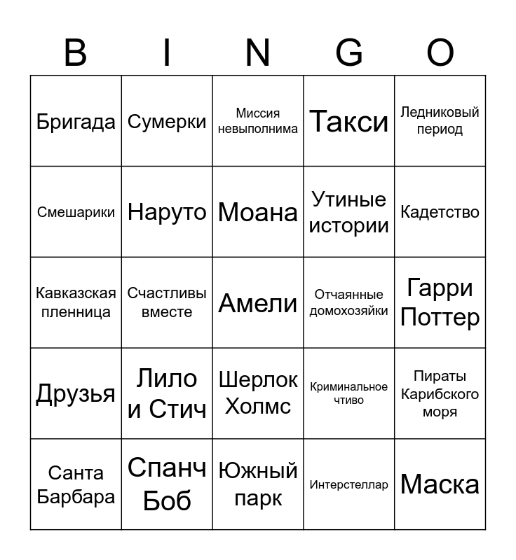 This bingo card has 42 words: Стражи Галактики, Моана, Шаман Кинг, Лило и Стич, Интерстеллар, Пираты Карибского моря, Амели, Джеймс Бонд, Миссия невыполнима, Шерлок Холмс, Гарри Поттер, Кадетство, Счастливы вместе, Ледниковый период, Брат 2, Криминальное чтиво, Иван Васильевич меняет профессию, Кавказская пленница, Бременские музыканты, Сумерки, Смешарики, Кухня, Маска, Бригада, Холодное сердце, Лалаленд, Утиные истории, Шрек, Рокки, Форсаж, Убить Билла, Друзья, Наруто, Южный парк, Человек паук, Санта Барбара, Спанч Боб, Отчаянные домохозяйки, Звездные войны, Красотка, Такси and Папины дочки.