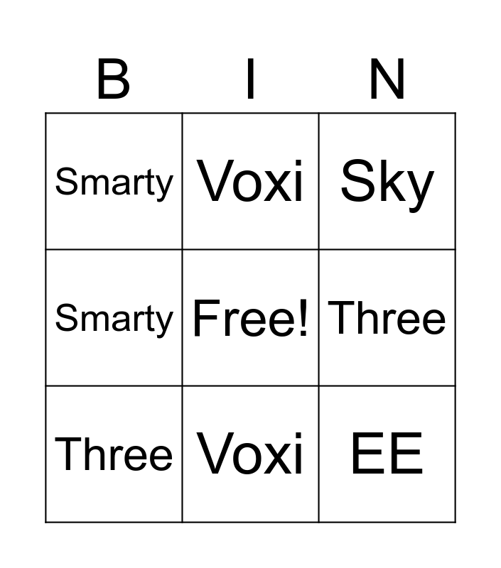 This bingo card has a free space and 14 words: O2, Sky, Three, Voxi, Smarty, EE, Tesco, Vodafone, Voxi, Smarty, Tesco, Three, Sky and EE.