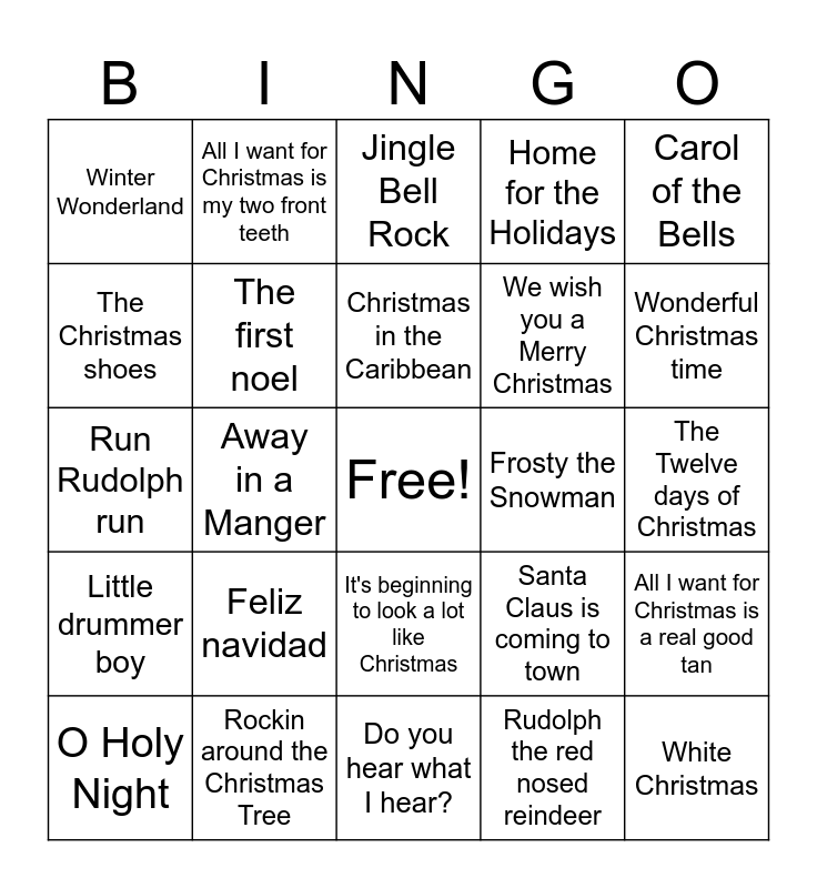 This bingo card has a free space and 44 words: Jingle Bells, White Christmas, Have yourself a very Merry Christmas, O Holy Night, The Chipmunk song, Rudolph the red nosed reindeer, Jingle Bell Rock, Here comes Santa Claus, Carol of the Bells, Rockin around the Christmas Tree, Home for the Holidays, Frosty the Snowman, It's beginning to look a lot like Christmas, Feliz navidad, Santa Baby, Do you hear what I hear?, Blue Christmas, Run Rudolph run, Silent night, Wonderful Christmas time, All I want for Christmas is my two front teeth, Holly Jolly Christmas, Sleigh ride, Winter Wonderland, Silver Bells, The Twelve days of Christmas, Last Christmas, I saw mommy kissing Santa Claus, Santa Claus is coming to town, Little drummer boy, Good King Wenceslas, All I want for Christmas is a real good tan, All I want for Christmas is you, Angels we have heard on high, Away in a Manger, Baby, it's cold outside, Boogie boogie Santa Claus, Christmas (baby please come home), Christmas in the Caribbean, The Christmas shoes, We wish you a Merry Christmas, Christmas Tree, The first noel and I want a hippopotamus for Christmas.