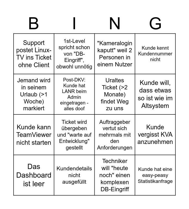 This bingo card has 21 words: Kundendetails nicht ausgefüllt, Kein TeamViewer angegeben, 1st-Level spricht schon von "DB-Eingriff", obwohl unnötig, Statistik-Ticket landet unnötigerweise im 3rd-Level, Techniker will "heute noch" einen komplexen DB-Eingriff, Uraltes Ticket (>2 Monate) findet Weg zu uns, Support postet Linux-TV ins Ticket ohne Client, "Kameralogin kaputt" weil 2 Personen in einem Nutzer, Auftraggeber vertut sich mehrmals mit den Anforderungen, Kunde will, dass etwas so ist wie im Altsystem, Kunde kann TeamViewer nicht starten, Kunde kennt Kundennummer nicht, Kunde hat eine easy-peasy Statistikanfrage, Kunde meldet sich ohne Namen, Post-DKV: Kunde hat LANR beim Admin eingetragen - alles doof, MFA schreibt sich selber Rezepte mit K-Signatur, Das Dashboard ist leer, Ticket wird übergeben und "warte auf Entwicklung" gestellt, Jemand wird in seinem Urlaub (>1 Woche) markiert, Kunde vergisst KVA anzunehmen and Kunde liest seine Mails nicht.