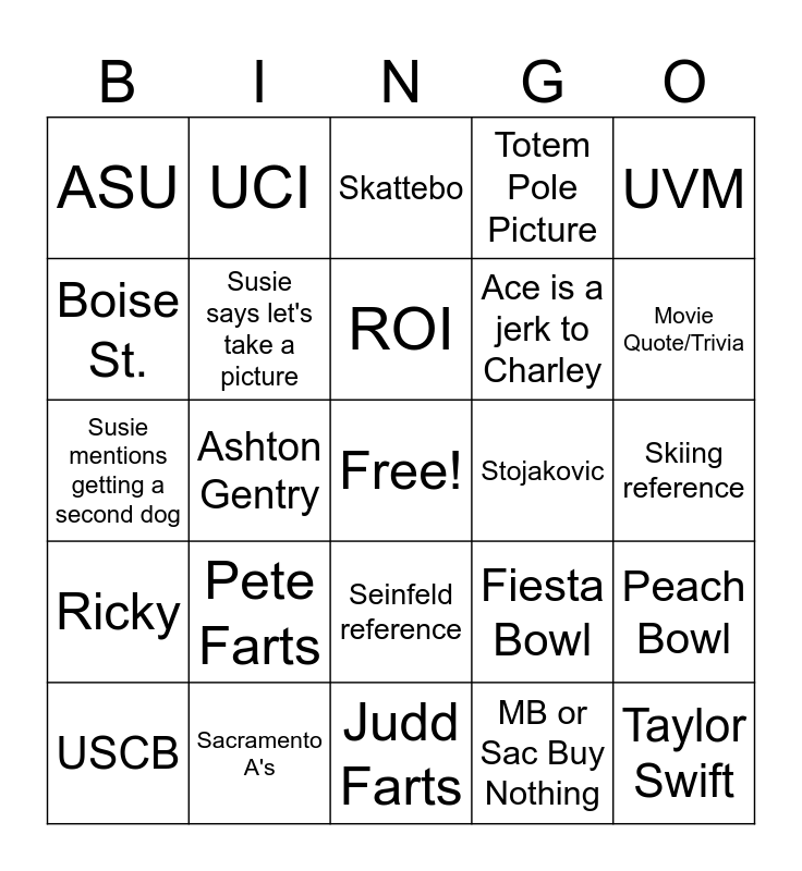 This bingo card has a free space and 25 words: Pete Farts, Judd Farts, ROI, USCB, UVM, ASU, Boise St., UCI, Stojakovic, Seinfeld reference, Ace is a jerk to Charley, Susie mentions getting a second dog, Fiesta Bowl, Peach Bowl, Susie says let's take a picture, Judd falls asleep on couch, Skiing reference, Skattebo, Movie Quote/Trivia, Ashton Gentry, Taylor Swift, Sacramento A's, Ricky, Totem Pole Picture and MB or Sac Buy Nothing.