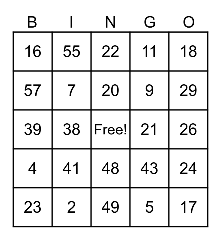 This bingo card has a free space and 58 words: 1, 2, 3, 4, 5, 6, 7, 8, 9, 10, 11, 12, 13, 14, 15, 16, 17, 18, 19, 20, 21, 22, 23, 24, 25, 26, 27, 28, 29, 30, 31, 32, 33, 34, 35, 36, 37, 38, 39, 40, 41, 42, 43, 44, 45, 46, 47, 48, 49, 50, 51, 52, 53, 54, 55, 56, 57 and 58.