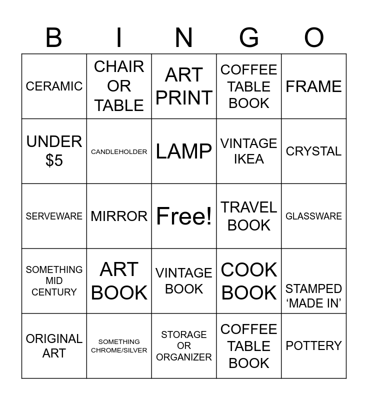 This bingo card has a free space and 24 words: ART BOOK, SOMETHING CHROME/SILVER, LAMP, ORIGINAL ART, FRAME, CERAMIC, UNDER $5, CHAIR OR TABLE, TRAVEL BOOK, VINTAGE BOOK, VINTAGE IKEA, SERVEWARE, COOK BOOK, STAMPED ‘MADE IN’, CANDLEHOLDER, COFFEE TABLE BOOK, GLASSWARE, ART PRINT, CRYSTAL, MIRROR, POTTERY, SOMETHING MID CENTURY, COFFEE TABLE BOOK and STORAGE OR ORGANIZER.