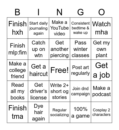 This bingo card has a free space and 24 words: Get driver’s license, Dye hair again, Get another piercing, Finish tma, Watch mha, Finish hxh, Finish mlp:fim, Start daily journaling again, Post art regularly, Write 2+ short og stories, Pass winter classes, Make a college friend, Join dnd campaign, Make a podcast, Catch up on wtn, 100% a game, Get a job, Make a YouTube video, Get my own plant, Get a haircut, Cosplay 2 characters, Read all my books, Consistent bedtime & wake up and Regular socializing.