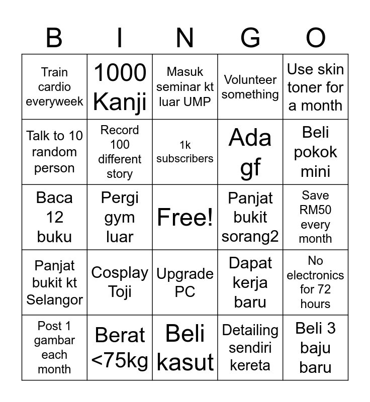 This bingo card has a free space and 24 words: Cosplay Toji, Berat <75kg, 1k subscribers, Post 1 gambar each month, Use skin toner for a month, Train cardio everyweek, Talk to 10 random person, 1000 Kanji, Panjat bukit sorang2, Upgrade PC, Ada gf, Baca 12 buku, Dapat kerja baru, No electronics for 72 hours, Record 100 different story, Detailing sendiri kereta, Save RM50 every month, Masuk seminar kt luar UMP, Beli pokok mini, Pergi gym luar, Beli 3 baju baru, Panjat bukit kt Selangor, Volunteer something and Beli kasut.