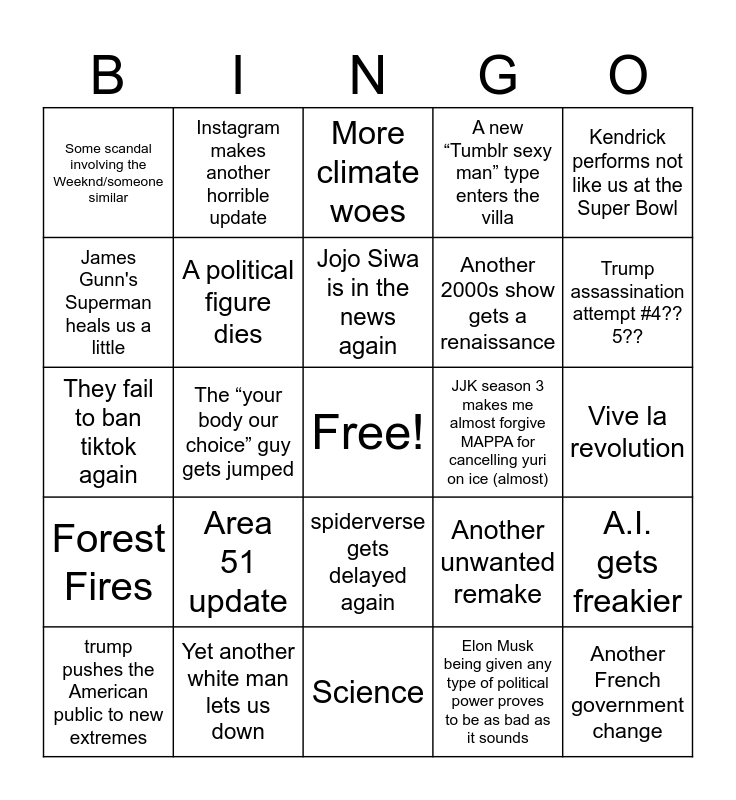 This bingo card has a free space and 24 words: Area 51 update, Yet another white man lets us down, Jojo Siwa is in the news again, trump pushes the American public to new extremes, Kendrick performs not like us at the Super Bowl, Some scandal involving the Weeknd/someone similar, James Gunn's Superman heals us a little, Instagram makes another horrible update, JJK season 3 makes me almost forgive MAPPA for cancelling yuri on ice (almost), spiderverse gets delayed again, Another 2000s show gets a renaissance, They fail to ban tiktok again, Another unwanted remake, A.I. gets freakier, A political figure dies, Elon Musk being given any type of political power proves to be as bad as it sounds, Vive la revolution, More climate woes, Trump assassination attempt #4??5??, The “your body our choice” guy gets jumped, Another French government change, Forest Fires, A new “Tumblr sexy man” type enters the villa and Science.