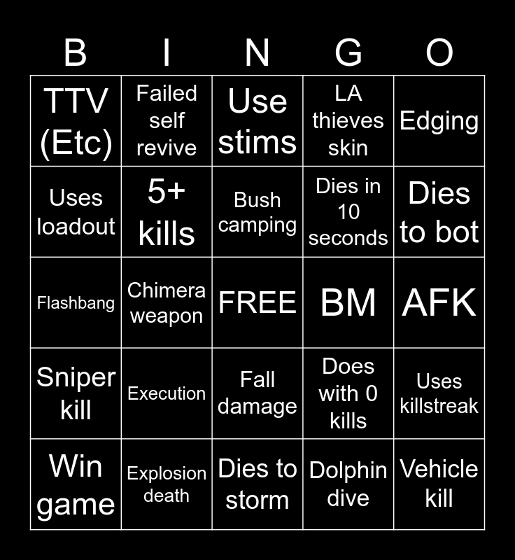 This bingo card has a free space and 24 words: Win game, Execution, Bush camping, Dolphin dive, Edging, TTV (Etc), Failed self revive, Use stims, BM, AFK, Flashbang, 5+ kills, Does with 0 kills, Uses killstreak, Uses loadout, Explosion death, Dies to storm, LA thieves skin, Dies to bot, Sniper kill, Chimera weapon, Fall damage, Dies in 10 seconds and Vehicle kill.